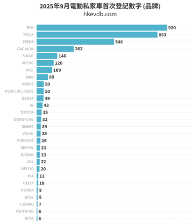 在9月的电动车品牌榜中,比亚迪以936辆居首,其后依次为特斯拉拉(853辆)、极氪(546辆)、广汽埃安(246辆)、宝马(146辆)及小鹏汽车(120辆)。