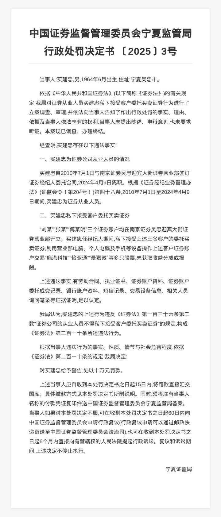 买建忠的上述行为违反《证券法》的规定,宁夏证监局决定对买建忠给予警告,并处以十万元罚款。