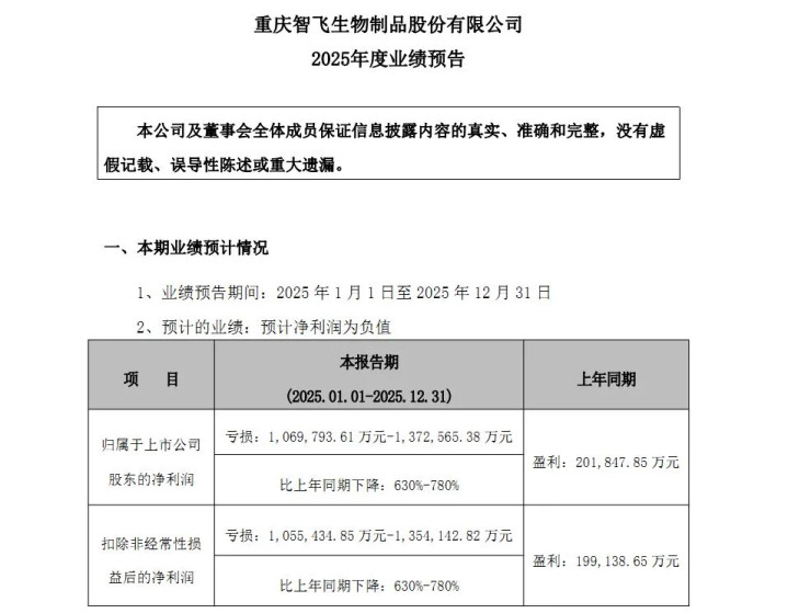 根据智飞生物2026年1月披露的业绩预告,公司预计2025年归属于上市公司股东的净利润亏损106.98亿元至137.26亿元,同比暴跌630%至780%,而上年同期为盈利20.18亿元;预计扣除非经常性损益后的净利润亏损105.54亿元至135.41亿元,同比下降630%至780%,而上年同期为盈利19.91亿元,公司核心盈利指标全面恶化,或将创下其上市以来最差年度业绩纪录。